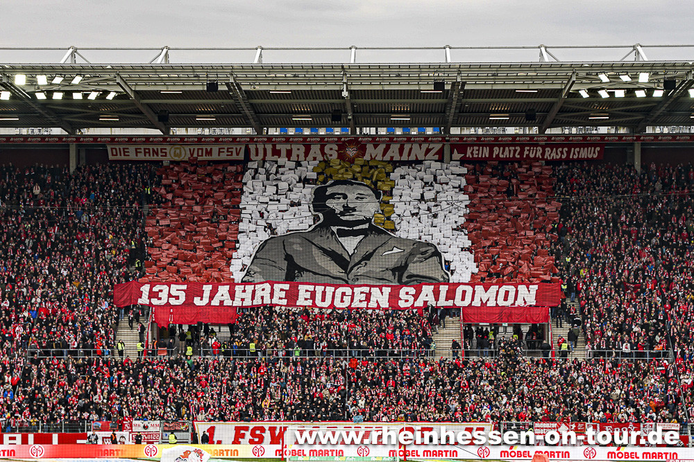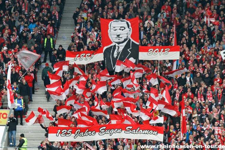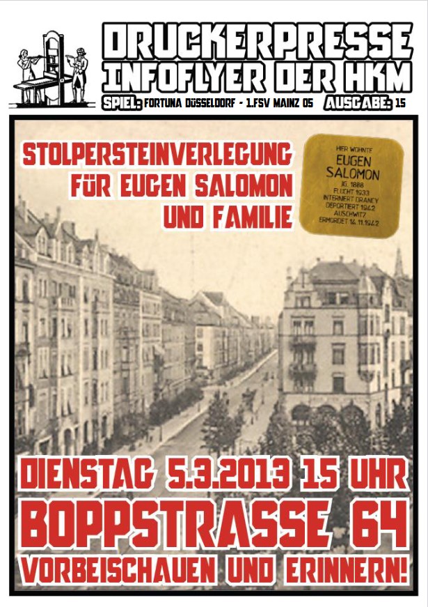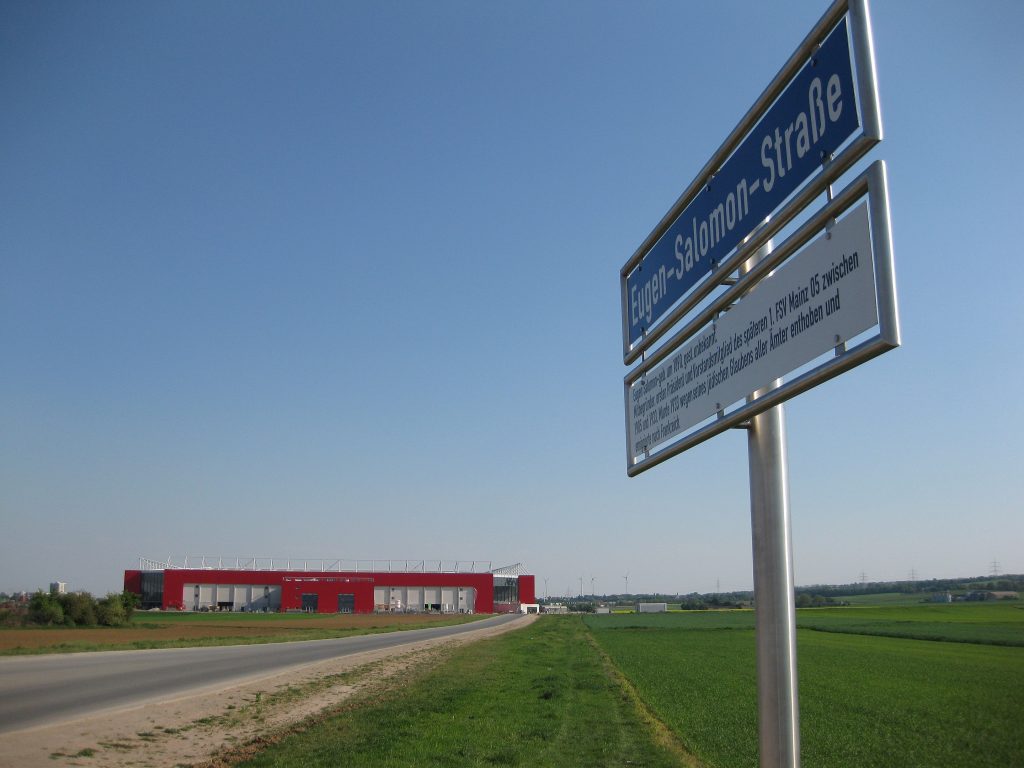 Als im Jahr 2010 die Straße zum neuen Stadion am Europakreisel einen Namen bekommen musste, wollte die Ortsverwaltung Bretzenheim dieser zuerst den Namen „Arenastraße“ geben.16 Als Gegenvorschlag kam von Seiten der Fans und der Supporters Mainz die Idee, die Straße nach Eugen Salomon, dem ersten Vorsitzenden des Vereins zu benennen und diesen auf diese Art zu würdigen.2 Bis zu diesem Zeitpunkt war über Eugen Salomons Leben nur wenig bekannt. Das Stadtarchiv Mainz wurde daraufhin beauftragt, Recherchen zu seiner Biografie durchzuführen. Auch die Mainzer Historikerin Hedwig Brüchert war hier sehr aktiv. Bei dieser intensiven Suche offenbarte sich, dass Eugen Salomon entgegen der damals herrschenden Annahme den Krieg nicht überlebt hatte und im Konzentrationslager ermordet wurde.