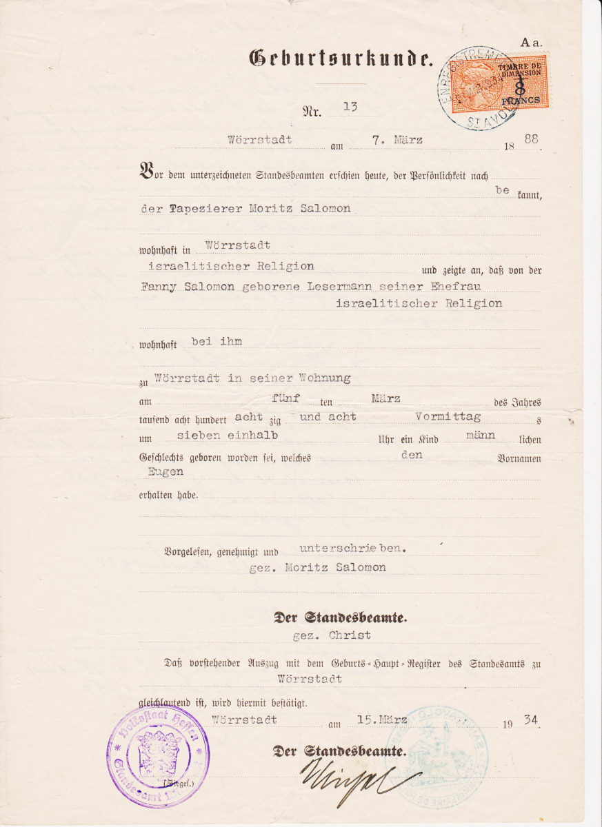 Geburtsurkunde von Eugen Salomon. Ausgestellt in Wörrstadt (Quelle Quelle Stolpersteine-mainz.de / Privat)