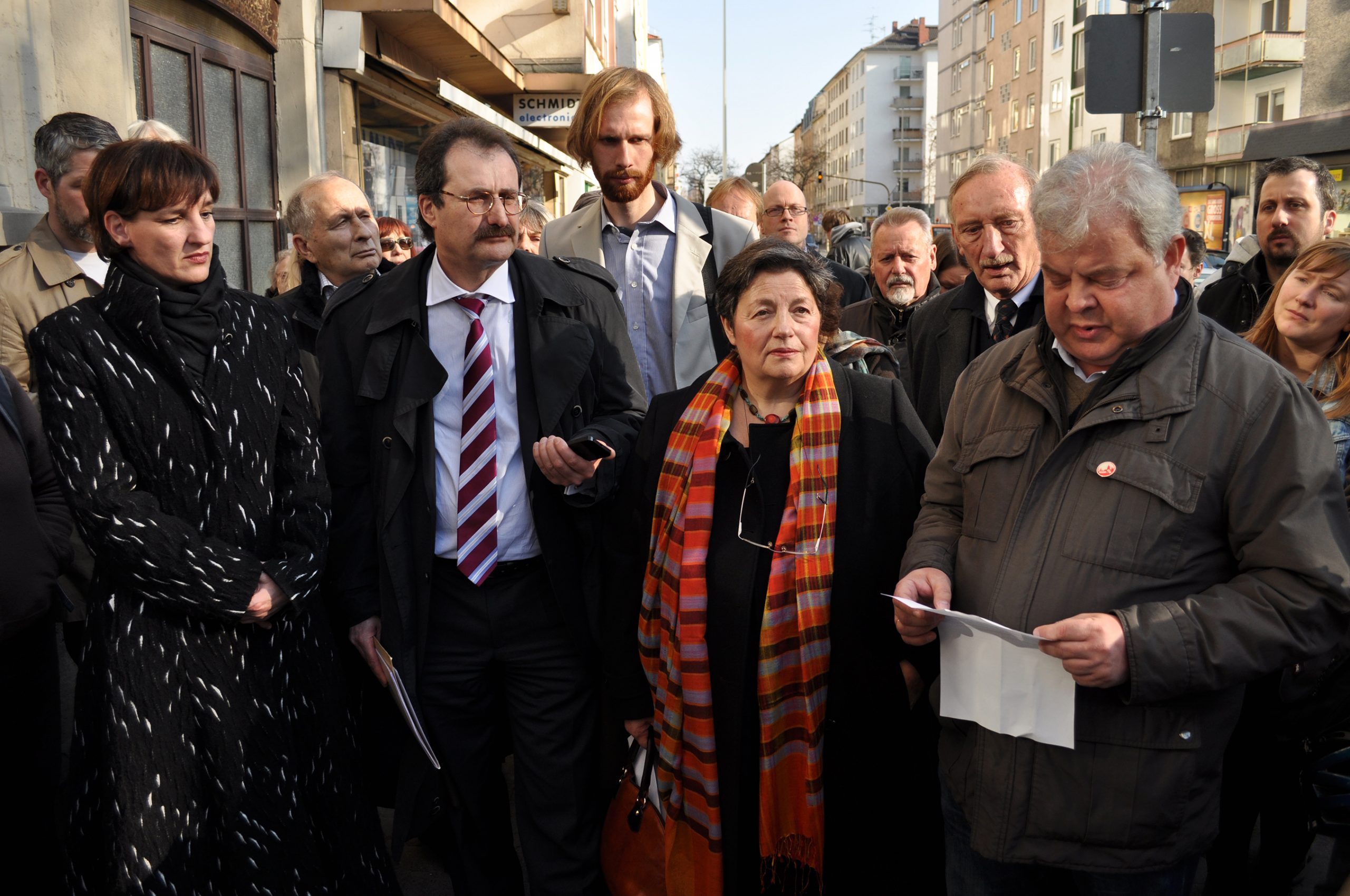 Stolpersteinverlegung im Jahr 2013 (Von links nach rechts) Marianne Grosse (Dezernentin der Stadt Mainz), Enkel Serge sowie Enkelin Lydie sowie Udo Seyfarth, damaliger Vorsitzender der Supporters Mainz